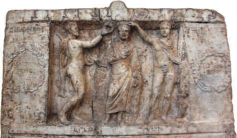 Este relieve muestra a dos concursantes, cada uno de los cuales coloca una corona en la cabeza de un entrenador y sostiene ramas de palma, que son símbolos de victoria (Atenas, principios del siglo III d.C.).